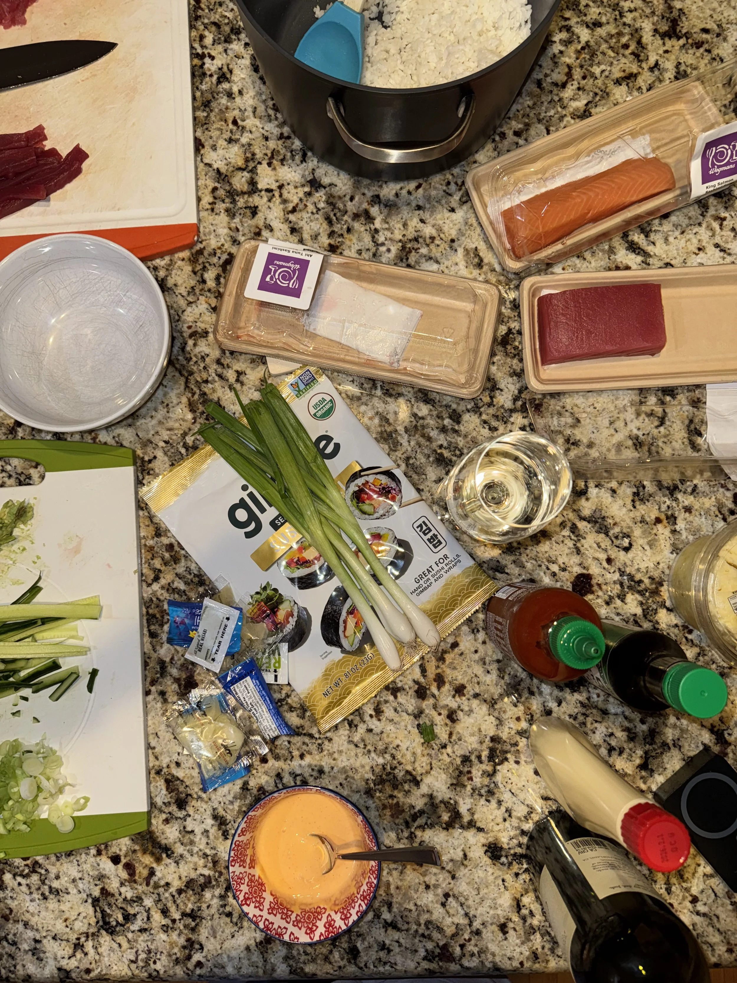 I don’t know how obvious it is or, honestly, how obvious I’ve made it but I LOVE sushi. So when I made an impromptu trip to go to Hobby Lobby to get supplies to make necklaces (I’m addicted and have made so many already), naturally, I got distracted by the kitchen items as one does and came across the cutest knick knacks and kitchen supplies to make homemade sushi. An immediate wave of decision making came over me (for the second time in two weeks - a very proud moment for me I might add) that my boyfriend and I were going to make homemade sushi that weekend. It was the perfect scenario to do so as well since we were house sitting and dog sitting and had no other plans last Friday night but to swim, have some drinks, and relax. So a date night at home was in the cards and we were ready to make some delicious dinner!