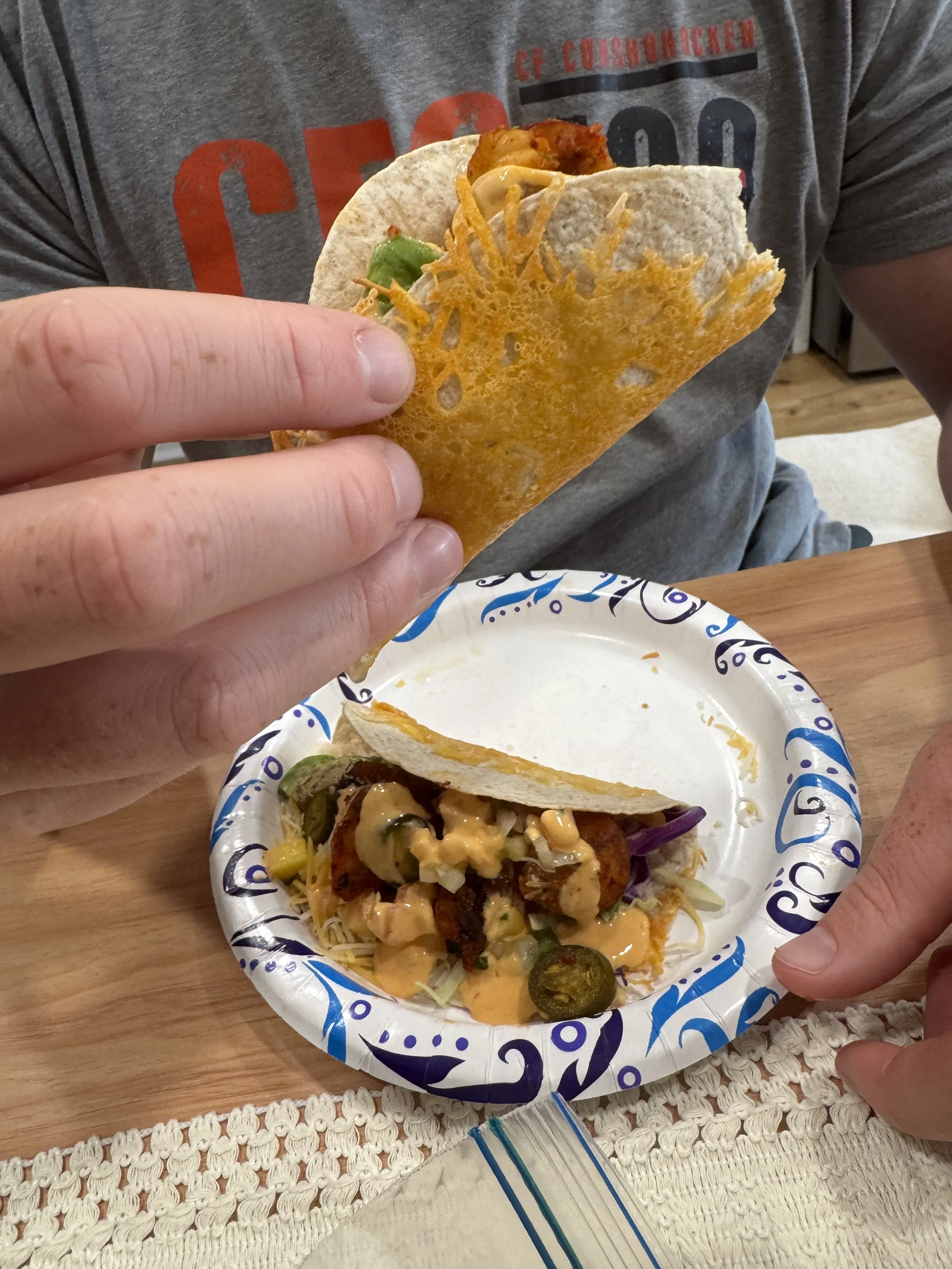 After last weekend’s seafood filled menu, I was really craving something healthy but also similar to the food we had the weekend before, so, we ended up making shrimp taco’s this weekend! I wanted to do something a little healthier though so we ended up going with a cabbage slaw lettuce mixture, low-card wheat tortilla’s, low-fat shredded Mexican cheese, an adobo chili creamy sauce, pineapple mango salsa, and a little slice of avocado because what is a taco without avocado?! These tacos really hit the spot though. We also topped them with some of Trader Joe’s hot and sweet jalapeños and it gave the perfect mix of sweet and heat to these tacos! We did have plenty left over for Sunday and we got a little creative by making a crispy cheese outer shell of the tortilla and I think this is going to be a trend that we keep the next time we make tacos or burritos!